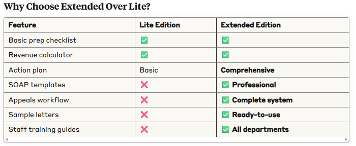 🛡️ The 16-page Extended Universal Downcoding Prep Checklist provides a thorough defense system that surpasses mere survival. Featuring professional templates, appeals tools, and staff training guides, you’ll be ready to push back and recover revenue before denials become a problem.