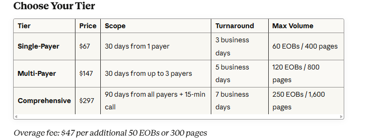 - Upload de-identified EOBs via secure form (link sent after checkout). You’ll receive upload instructions immediately after purchase — no PHI or patient identifiers required.